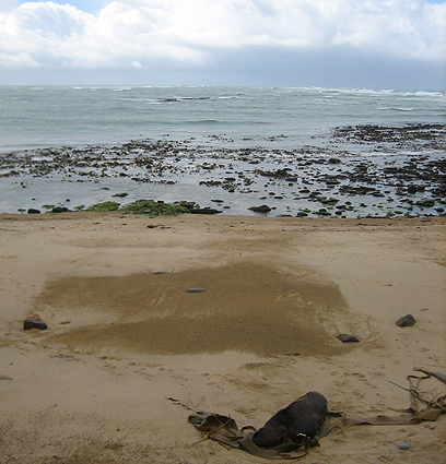 砂浜を見ても手前に黒い岩があるだけで、ほかに何も見当たりません。
