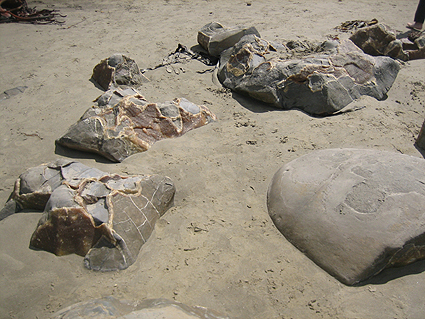 海岸の一部に大きなものから小さなものまで、さらに割れているものまでが砂浜にありました。